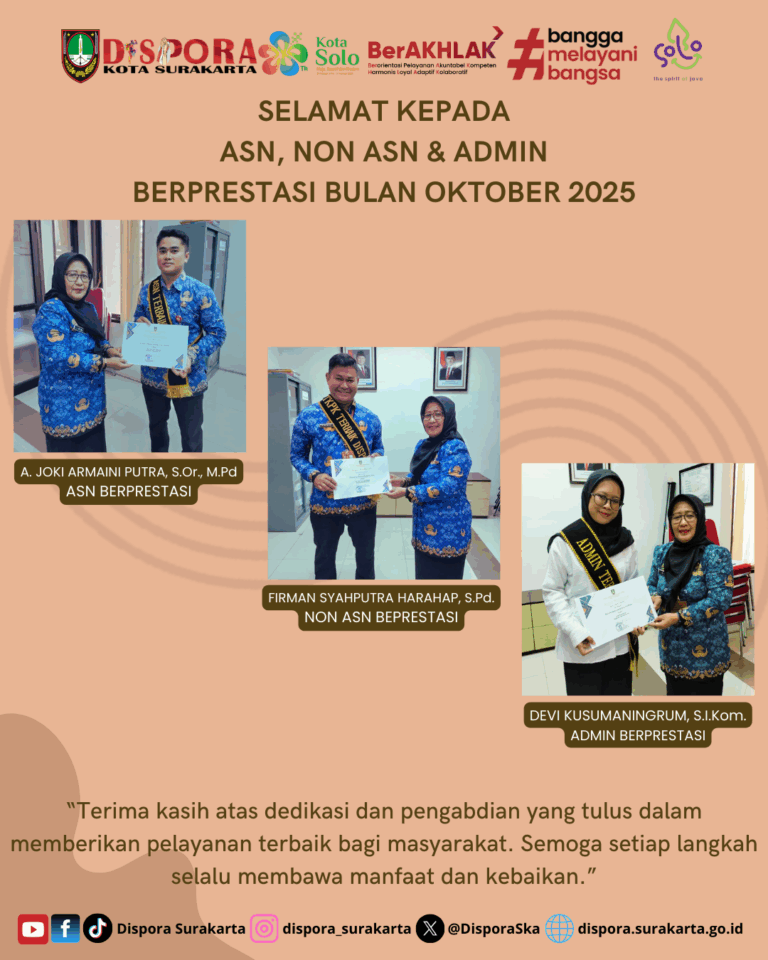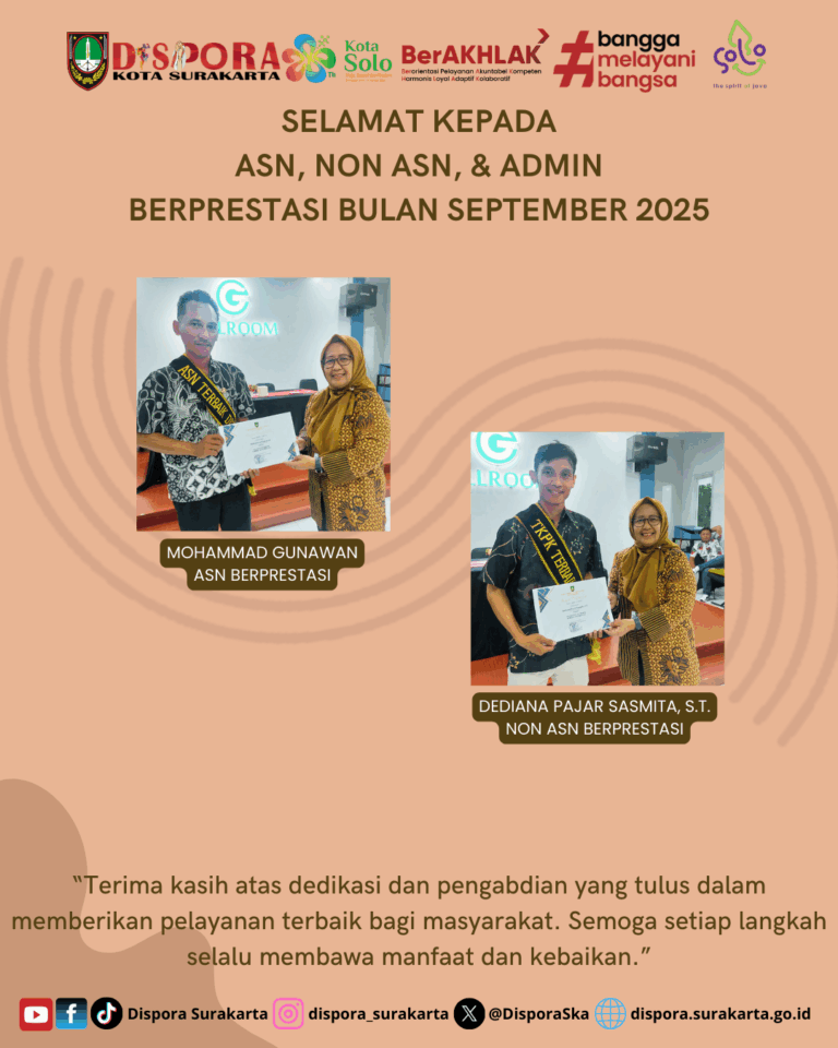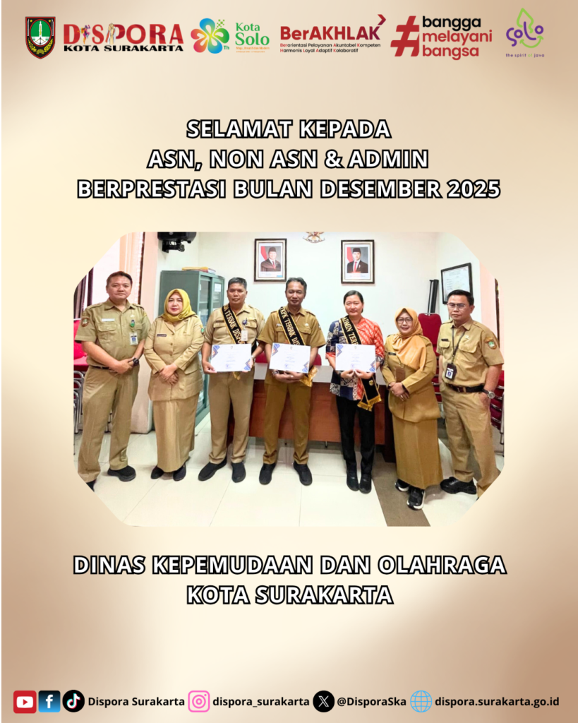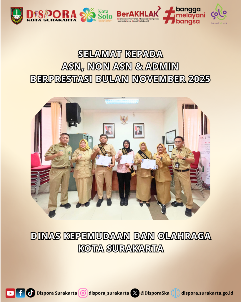 KepemudaanOlahraga Prestasi dan Rekreasi 3 weeks ago ASN & NON ASN BERPRESTASI BULAN SEPTEMBER 2025 🏅 ASN & Non ASN Berprestasi – September 2025 Dinas Kepemudaan dan Olahraga Kota Surakarta…