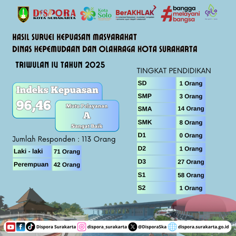 KepemudaanOlahraga Prestasi dan Rekreasi 2 weeks ago HASIL SURVEY KEPUASAN MASYARAKAT (SKM) DISPORA KOTA SURAKARTA TW IV TAHUN 2025 📊 Hasil Survei Kepuasan Masyarakat (SKM)Dinas Kepemudaan dan Olahraga Kota SurakartaTriwulan IV Tahun 2025 ✨…