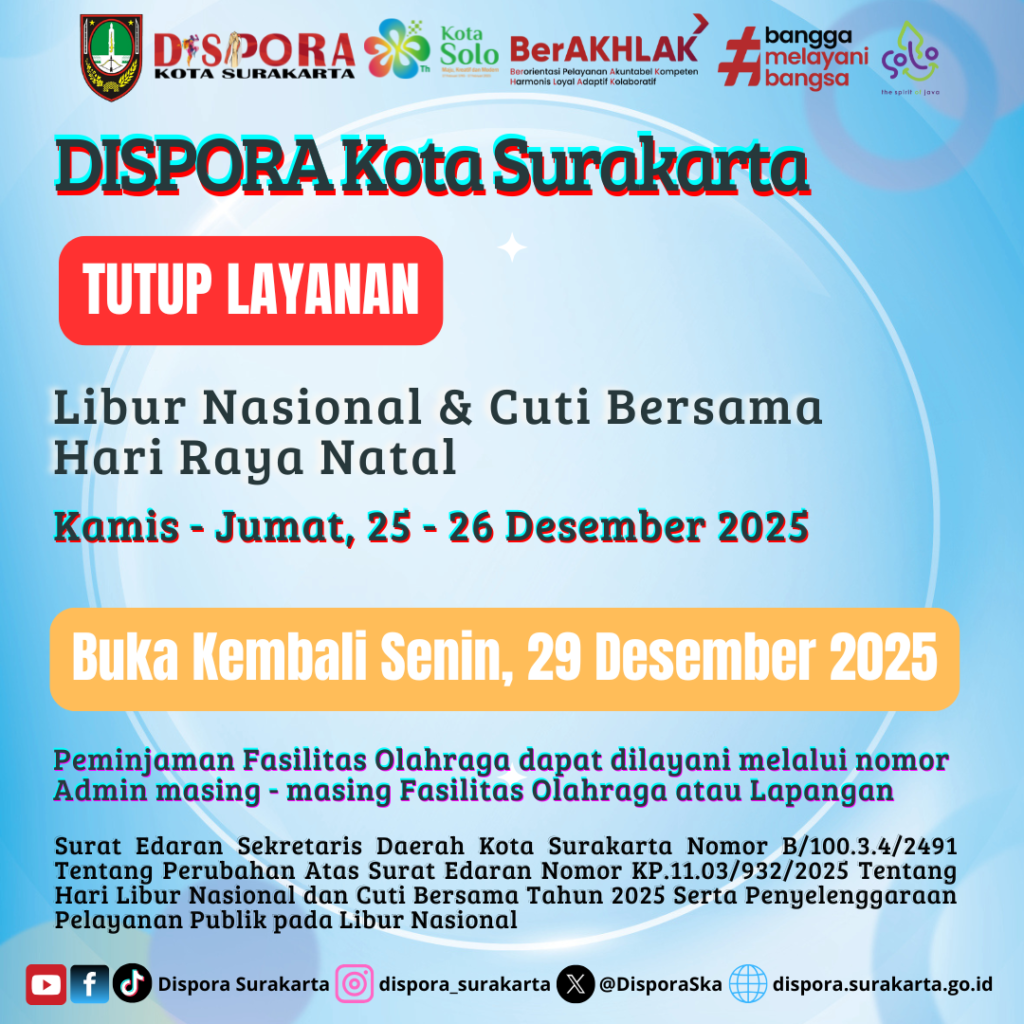 KepemudaanOlahraga Prestasi dan Rekreasi 19 hours ago TUTUP LAYANAN DISPORA DALAM RANGKA HARI RAYA NATAL 📢 Pengumuman Layanan DISPORA Kota Surakarta Dinas Kepemudaan dan Olahraga Kota Surakarta menutup layanan dalam…