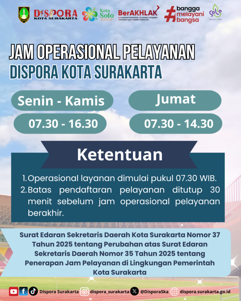 KepemudaanOlahraga Prestasi dan Rekreasi 3 weeks ago JAM OPERASIONAL PELAYANAN DISPORA KOTA SURAKARTA 📌 Jam Pelayanan DISPORA Kota Surakarta 🗓️ Senin – Kamis⏰ 07.30 – 16.30 WIB 🗓️…