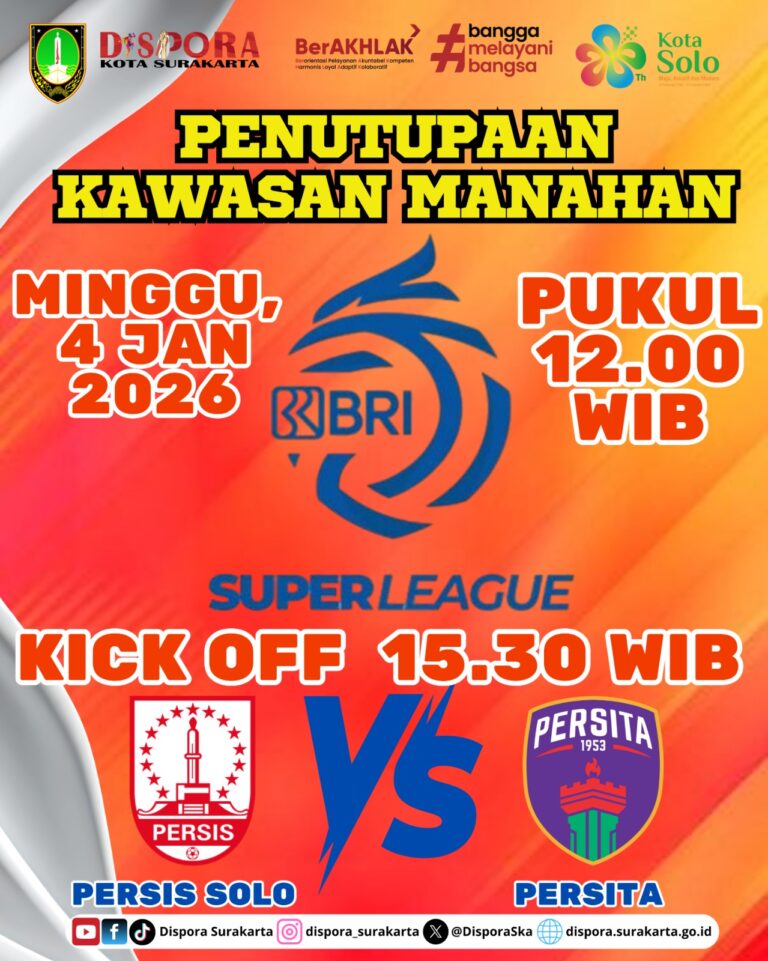 Sarpras dan Olahraga Pendidikan 3 weeks ago PENUTUPAN KAWASAN MANAHAN BRI SUPER LEAGUE PERSIS SOLO vs PERSITA TANGERANG 🚧 PENGUMUMAN PENUTUPAN KAWASAN MANAHAAN 🚧 Halo warga Solo!Kawasan Manahan akan ditutup sementara pada: 📅…