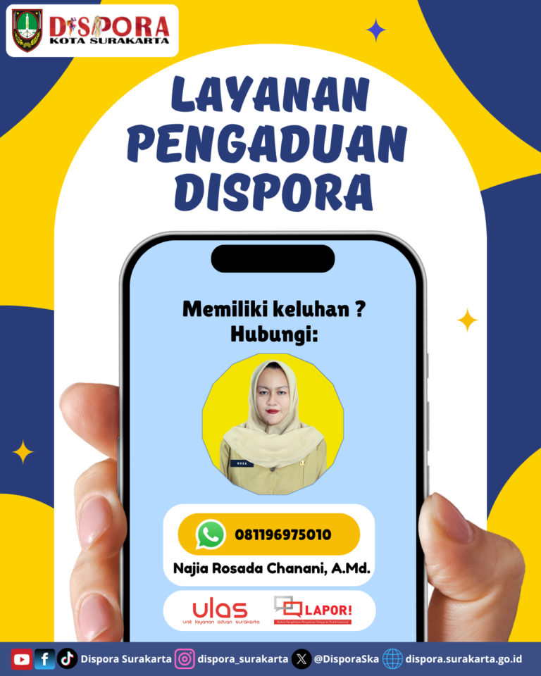 KepemudaanOlahraga Prestasi dan Rekreasi 1 week ago PETUGAS ADUAN DISPORA KOTA SURAKARTA Halo Sobat DISPORA 👋Kami terbuka terhadap kritik dan saran dari masyarakat demi peningkatan layanan yang…