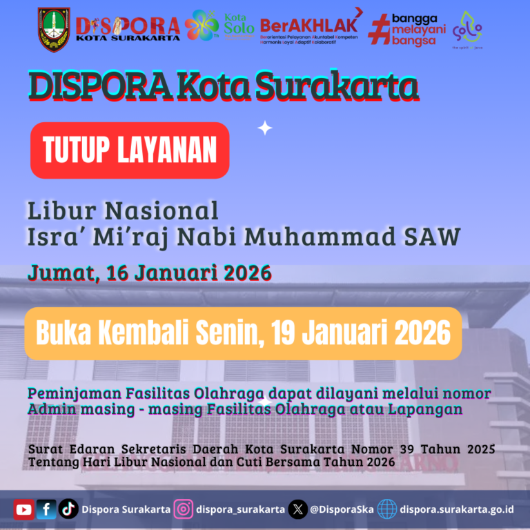 KepemudaanOlahraga Prestasi dan Rekreasi 1 week ago TUTUP LAYANAN ISRA’ MI’RAJ 📢 PENGUMUMANSehubungan dengan Libur Nasional Isra’ Mi’raj, layanan DISPORA Kota Surakarta tutup pada: 🗓️ Jumat,…
