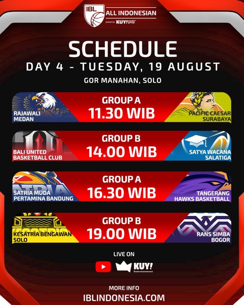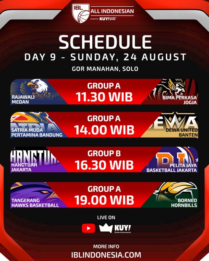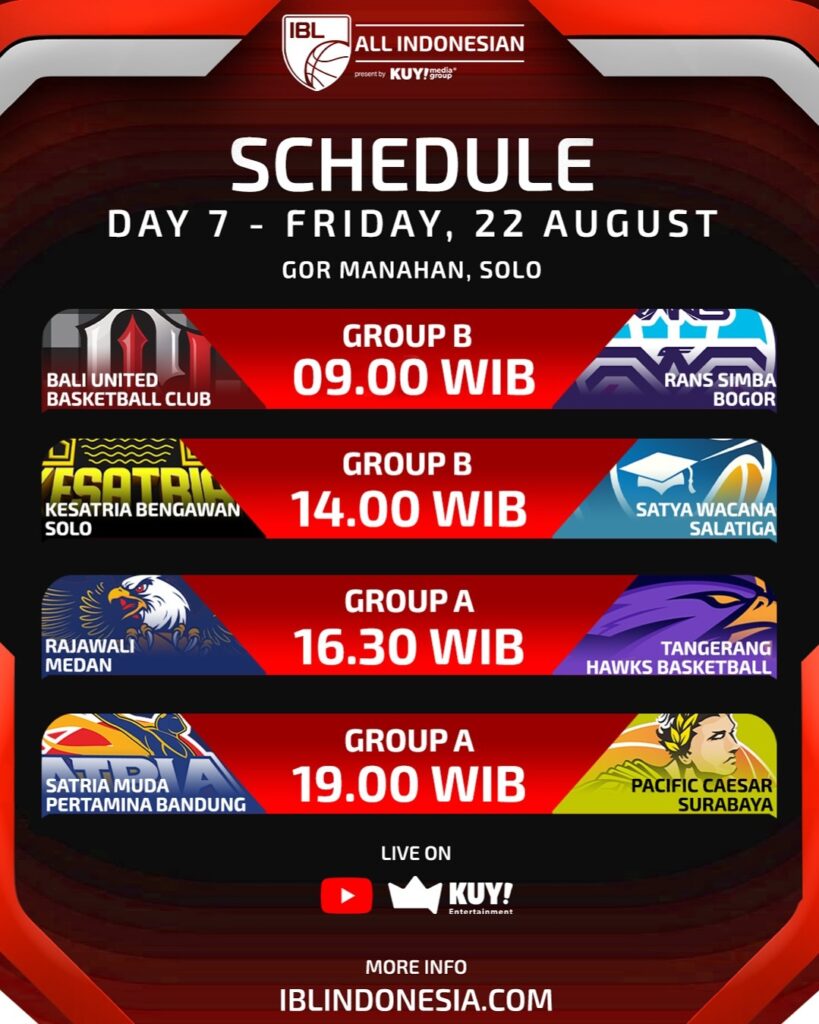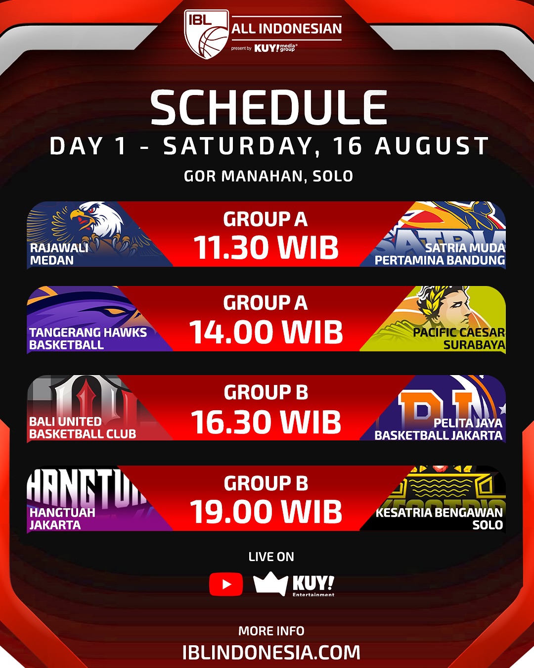 Tim-tim akan bersaing untuk memperebutkan #PialaMenpora di GOR Indoor Manahan, Solo!!🏆 📆 Fase Grup: 16-24 Agustus Urutan pertama dan kedua dari tiap grup akan melaju ke babak berikutnya: 🔥 Semifinal: 26 Agustus 🔥 Final: 28-31 Agustus 📺 Live on YouTube KUY Entertainment Catat tanggalnya, IBL Fans! Jangan sampai kelewatan untuk dukung langsung tim favorit kalian Mari Kita Dukung Tim Kesatria Bengawan Solo Agar Bisa Menjuarai Indonesia Basketball League….