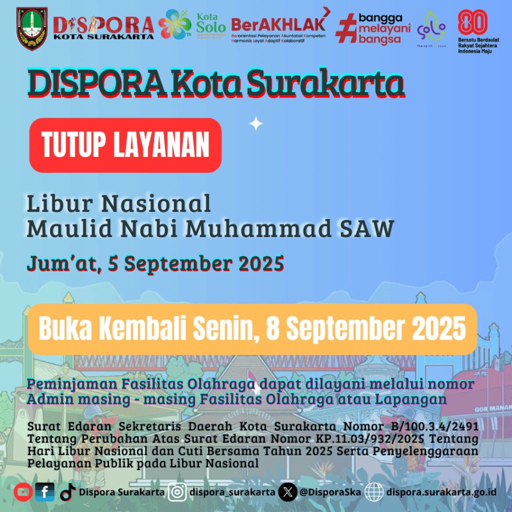 Sehubungan dengan adanya Libur Nasional Maulid Nabi Muhammad SAW, DISPORA Kota Surakarta tutup pelayanan pada Jumat, 5 September 2025