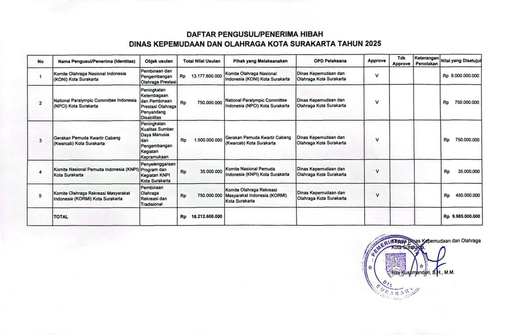 Dinas Kepemudaan dan Olahraga Kota Surakarta mengumumkan daftar pengusul dan penerima hibah tahun anggaran 2025 sebagai bentuk transparansi dan akuntabilitas dalam pengelolaan bantuan hibah pemerintah daerah.
