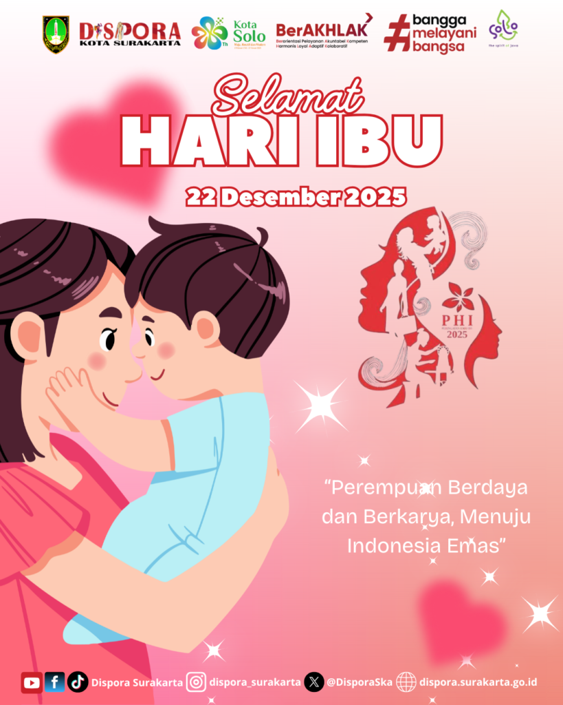 Dinas Kepemudaan dan Olahraga Kota Surakarta menyampaikan penghormatan setinggi-tingginya kepada seluruh ibu dan perempuan Indonesia atas cinta, ketulusan, keteguhan, serta perannya yang luar biasa dalam keluarga, masyarakat, dan pembangunan bangsa.